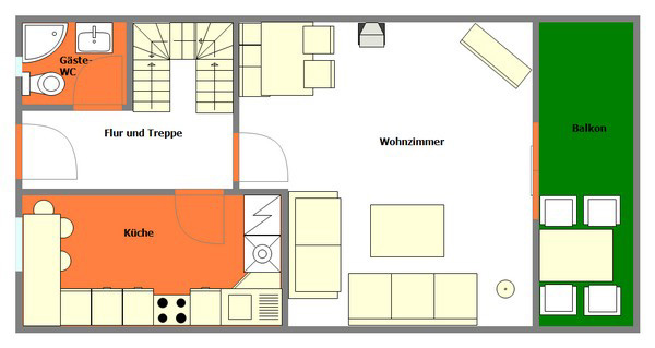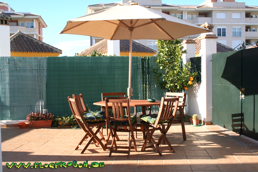 Directly from the lounge you get to our balcony. Here you can have breakfast! Even at Christmas the temperatures were already suitable for a late breakfast in the sun. In the summer, playing cards, reading a book while sipping a sangria is a great way to end the day, while a gentle breeze caresses the skin in the evenings. Since our holiday rental is a corner house, it has significantly more floor space than the comparable buildings of the settlement. So our guests not only have a large terrace, but also our lovingly maintained garden with a variety of fruit trees.
