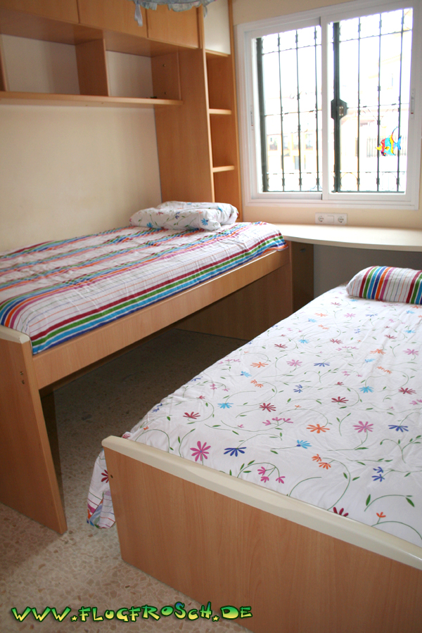 There are 3 bedrooms, an air-conditioned with double bed, one with a step bed and another with a double bed. Bed linen is available in sufficient quantities on site. And then something else: All windows in the two upper floors have been replaced by modern German PVC windows with double glazing and are reinforced with mosquito nets. All shutter boxes were soundproof and insulated; noise and outside temperature stay outside.