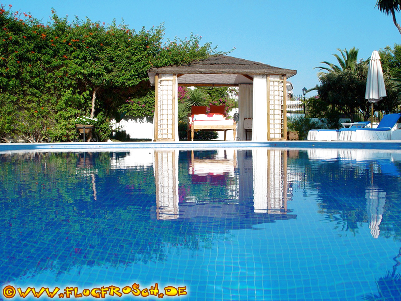 The bright blue of the seawater pool, the palms, the exotic plants and the designer garden furniture are a welcome inspiration for peace and quiet. The pool is located in a well maintained garden with view to the Mediterranean Sea and shielded from the outside world by tropical vegetation.